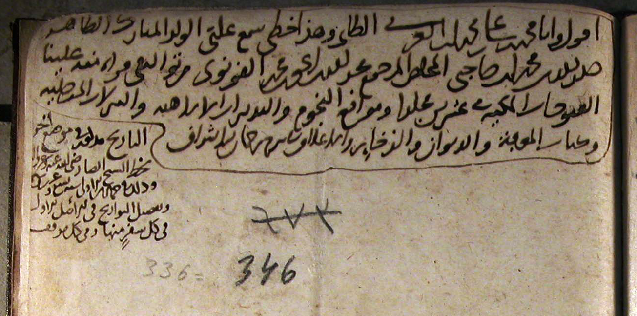 [تصديق الشيخ الأكبر على قراءة القونوي لبعض الكتب، من مخطوطة يوسف آغا 7838.]جزء من الصفحة 346أ من مخطوطة يوسف آغا 7838 وفيه تصديق الشيخ الأكبر على قراءة ربيبه صدر الدين القونوي لبعض الكتب.